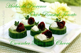 The idea for this one came from a newspaper from one of my local health food stores; that version did not form the "roses", simply indicatedto place a piece of the oven-roasted tomato with a scoop of cheese on the cucumber.